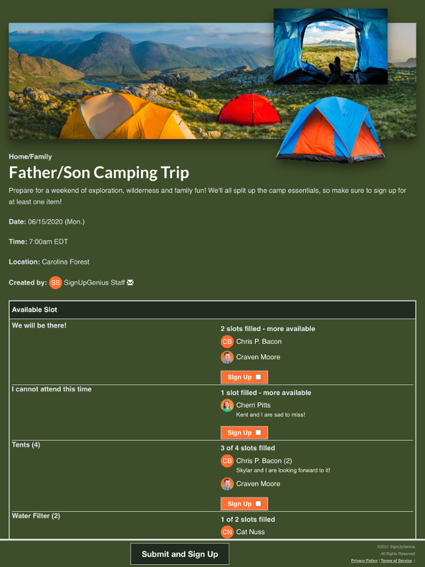Dreaming of sleeping under the stars this summer? Whether you pitch a tent in your backyard or hit the road for a camping weekend with friends, you'll make memories on your outdoor adventure. Create a sign up for your group to coordinate all the camping essentials from flashlights to s'mores.