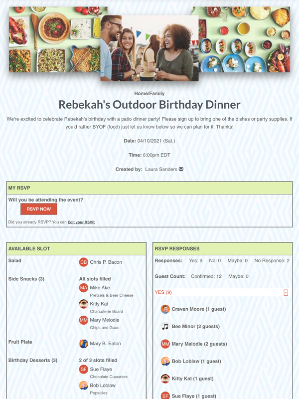 An outdoor dinner party can be as simple as a cookout or a fancy potluck affair with white tablecloths and dreamy lighting. Use an online sign up to collect RSVPs and request food items and all the essentials. You can set quantity limits for items to make sure you don't end up with 10 side dishes and no napkins.