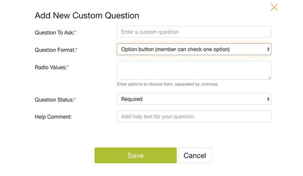 • If you need to request additional information on the form, create custom questions and select parameters for responding to the question. Under the "Ask Participants For" section, click on the More button and select the Add a Custom Question box. Basic plans can add one custom question and Silver, Gold and Platinum subscribers can add 2-10 custom questions depending on their plan level.