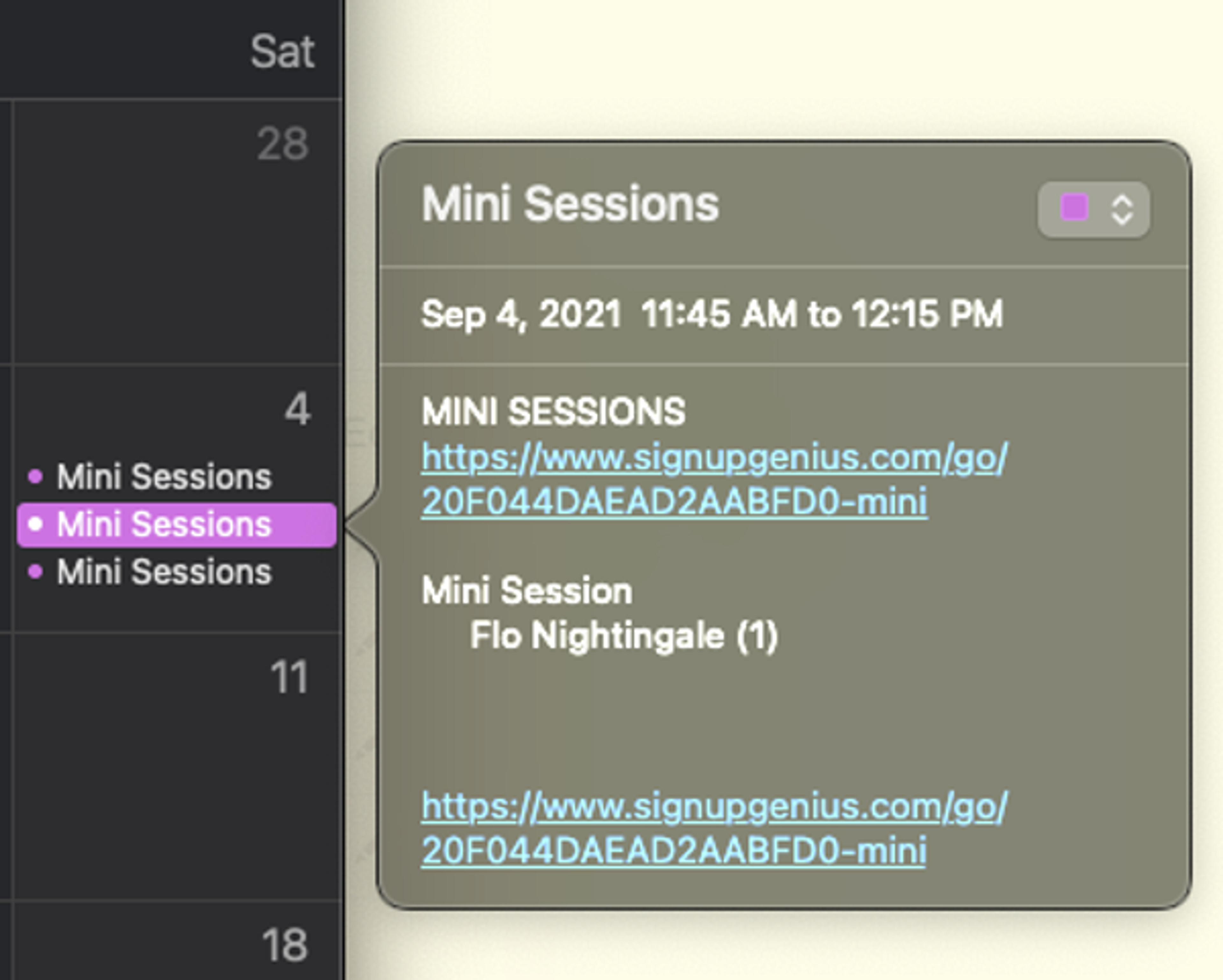 Once you've set up the link, you'll be able to view the appointments on your calendar program. As more people sign up, the appointments will appear on your personal calendar. You can easily see the name and appointment booking along with a link back to the sign up. This is very helpful if you have multiple sign ups synced to your calendar.