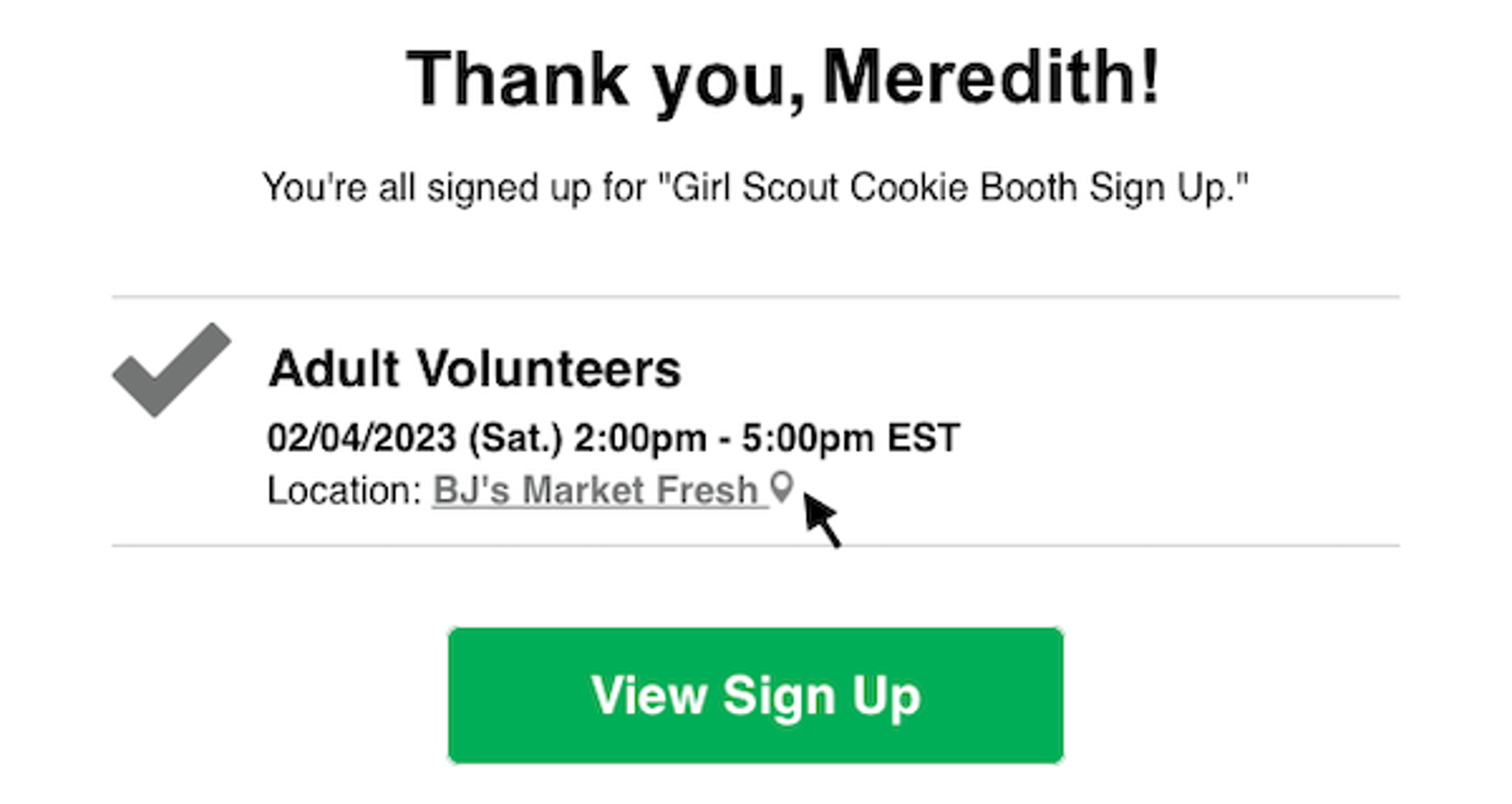 The location links to Google Maps and will appear on the sign up and in the confirmation and reminder emails that go out to participants. This makes it easy to access and locate the address for a booth. Participants will never be confused about where to go again!