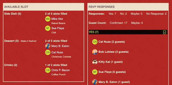 One of the most important steps in planning your party is to get the word out and let people know about the festive event you are planning. Online sign ups are a great way to let others know about your holiday party. Build a sign up and share it with others to easily invite people to your party. Use our rsvp format to get an accurate headcount.