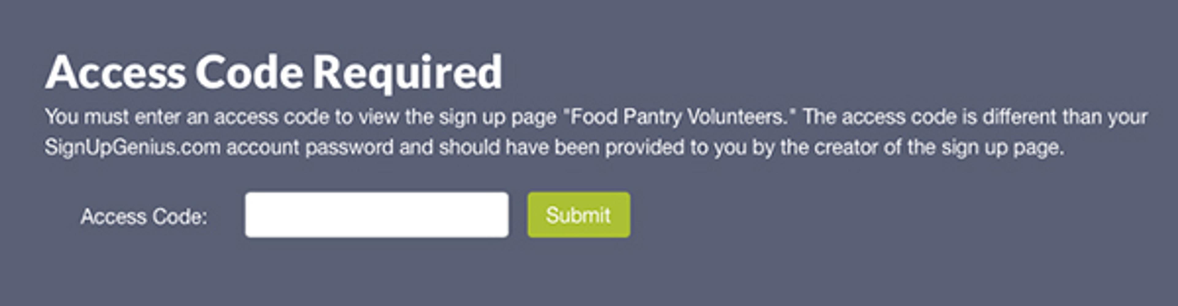 Want to limit who can view your sign up? An access code is a way of adding more privacy to your sign up. Only people with the code can view your sign up. Anyone who visits your sign up will first be prompted to enter the code before they can access the sign up page. In addition to hiding names on a sign up, this is one more way to boost the privacy of your event details.