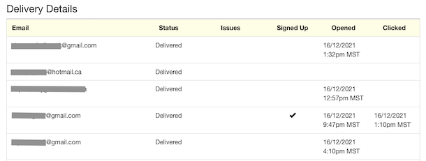 Under Message Details, you can view the email text that was sent. Click Message Analytics to view the list of email addresses to whom the invite was sent and check for any emails that were not delivered. If you are a Gold, Platinum or Enterprise subscriber, you can see which invitees opened your email and clicked the sign up link.
