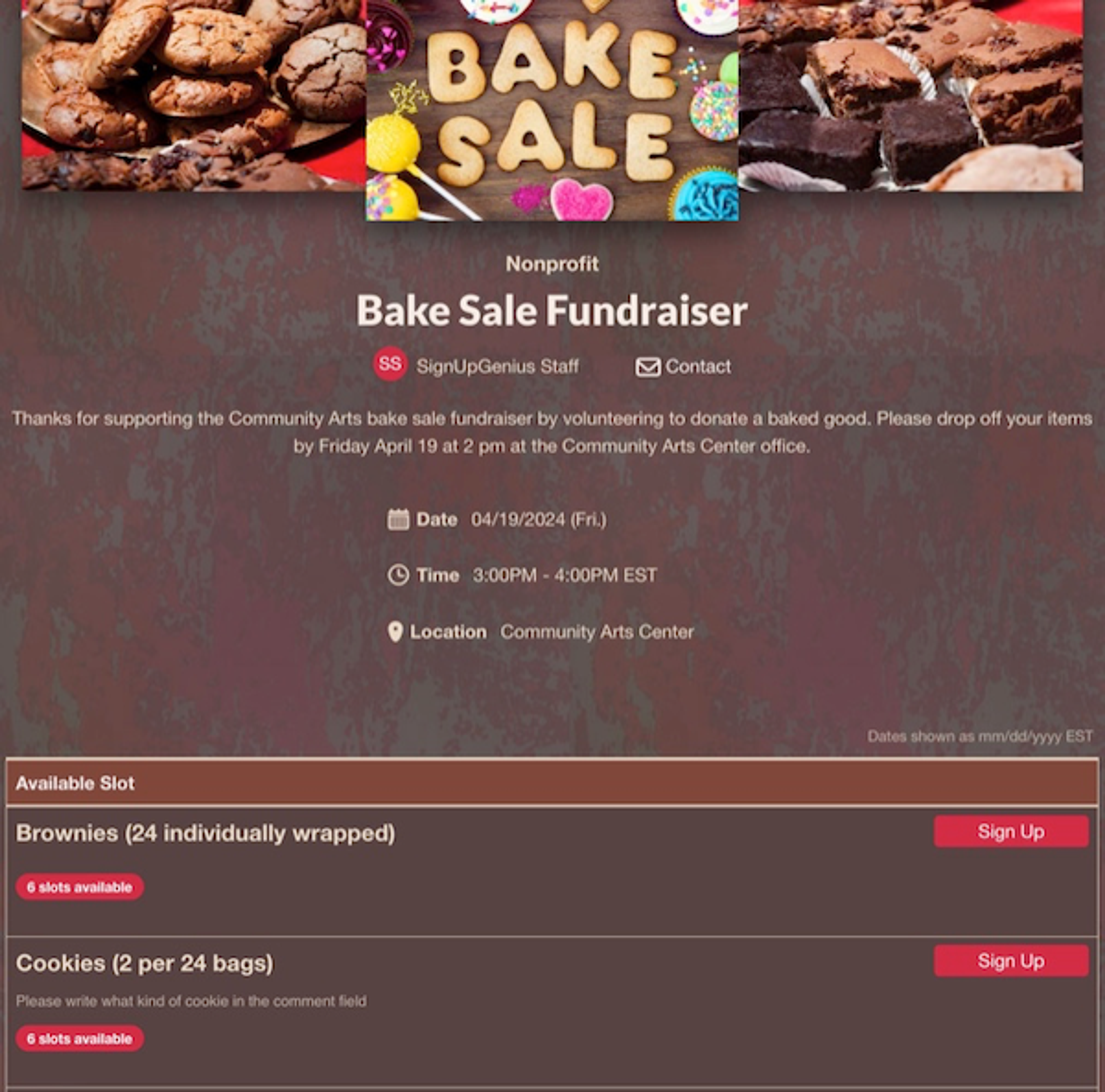 Selling items like baked goods, raffle tickets or arts and crafts can be an effective way to boost your fundraising efforts. Selling things that reflect your nonprofit or feature local businesses can help your fundraiser stand out. Organizing in-person sale events provides great opportunities to connect with your community and share your mission. Sign ups make it easy to coordinate volunteers and expand your audience with online sales.