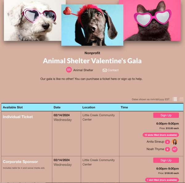 Invite your community for a night of celebration in their finest! Gala events give nonprofits an opportunity to thank donors in person and share how your work is making a difference. Sign ups streamline organizing for formal events so leaders can spend more time connecting with supporters. You can take care of important planning details with a sign up such as collecting RSVPs and organizing volunteers.