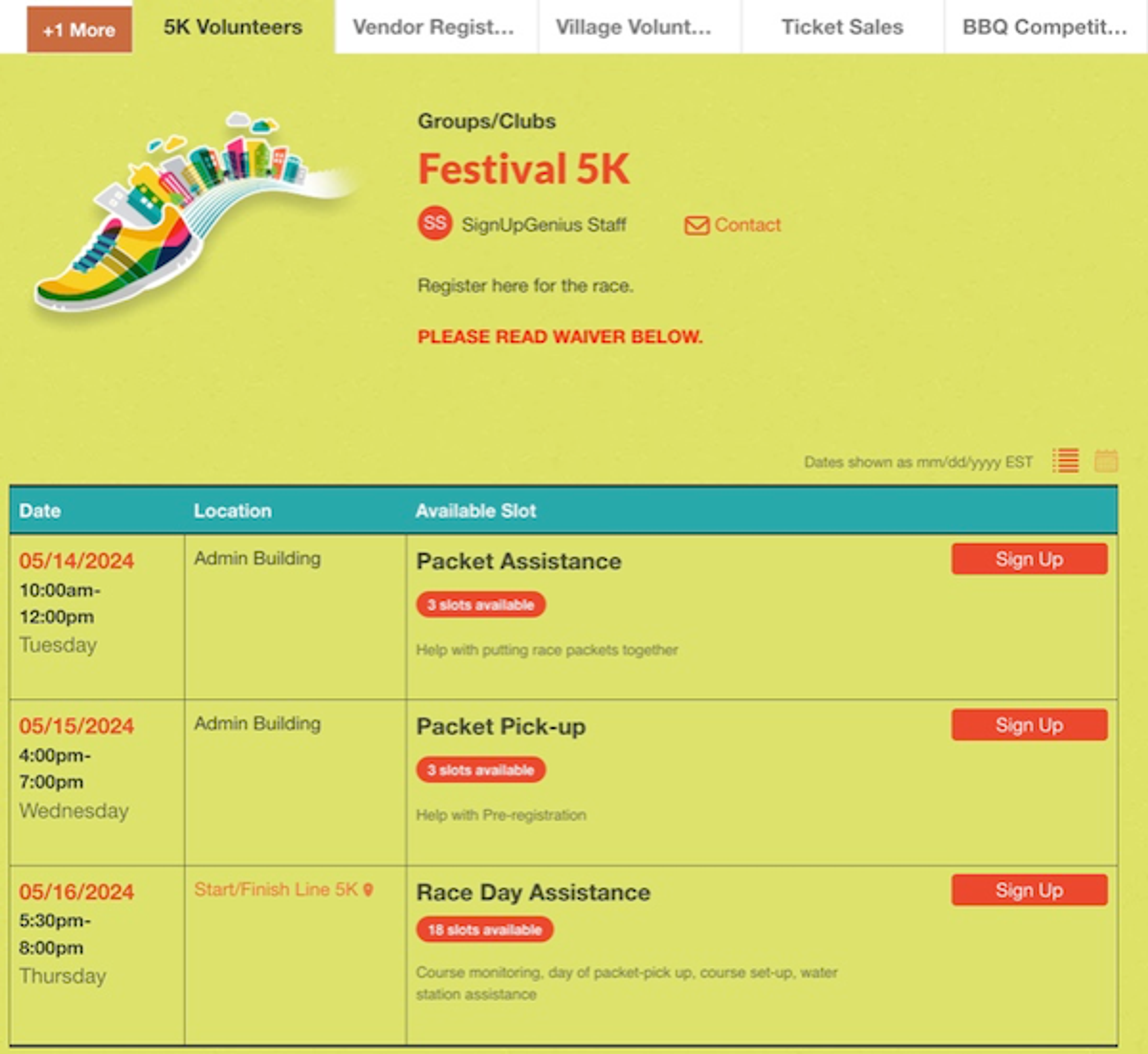 Choose a sign up design that reflects your event and create slots for registration and volunteer roles. You can also create separate sign ups for event volunteers and another for registration. We offer several ways to display separate sign ups together so people can easily find all your opportunities.