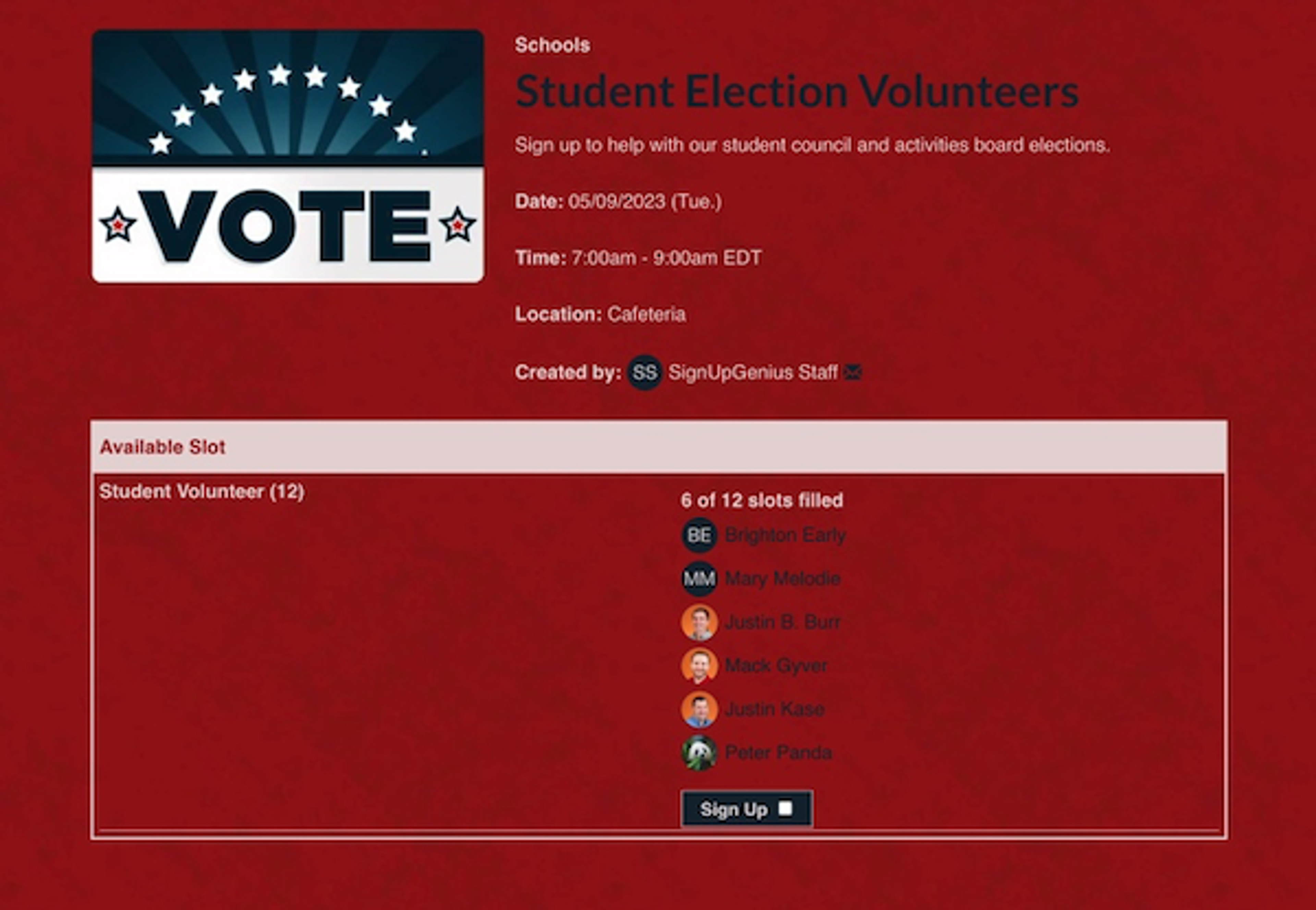 Online sign ups help coordinate student government initiatives such as committees, elections and advocacy. To organize events efficiently, you can share the work of managing sign ups with the multiple administrator feature. Assigning different levels of permission to others allows some people to just monitor slots and others to edit the sign up.