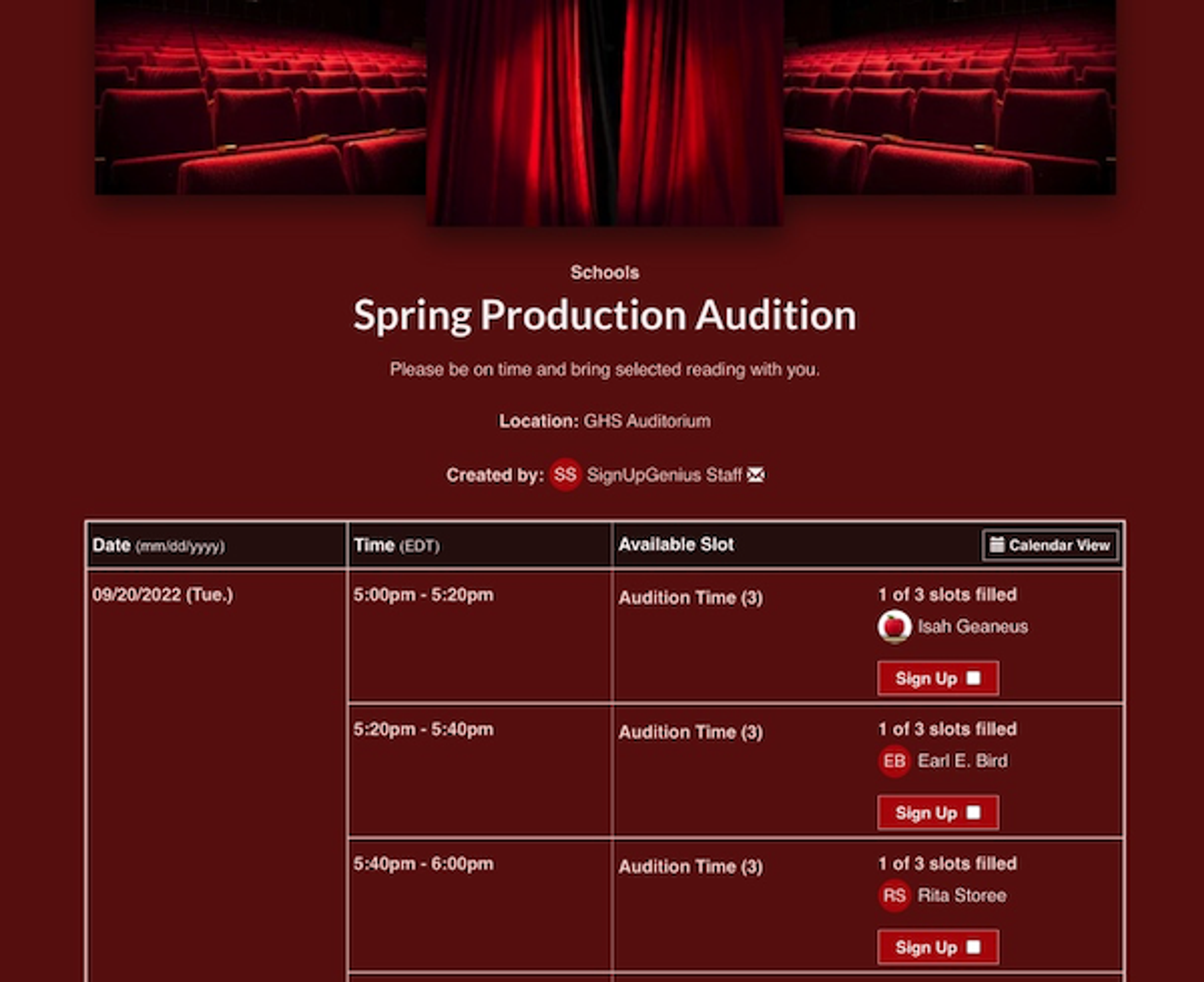Teachers are often responsible for planning events like concerts and theater performances along with teaching classes, making it important to save time whenever possible. Online sign ups help coordinate events such as theater auditions and fundraisers, simplifying scheduling and communication. With this helpful tool, teachers can easily request volunteers and share opportunities for students through digital channels. Once participants are signed up, you can send more details with custom confirmation and reminder emails.