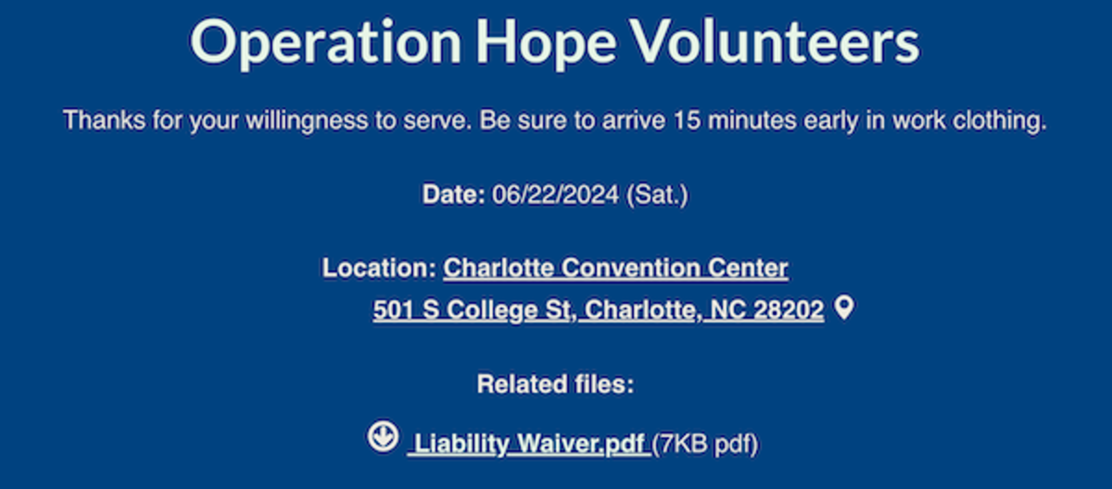 It's also important to communicate all project logistics up front. On a sign up you can attach waivers, share the location with our mapping feature, or customize a confirmation message to ensure that your participants have everything they need.