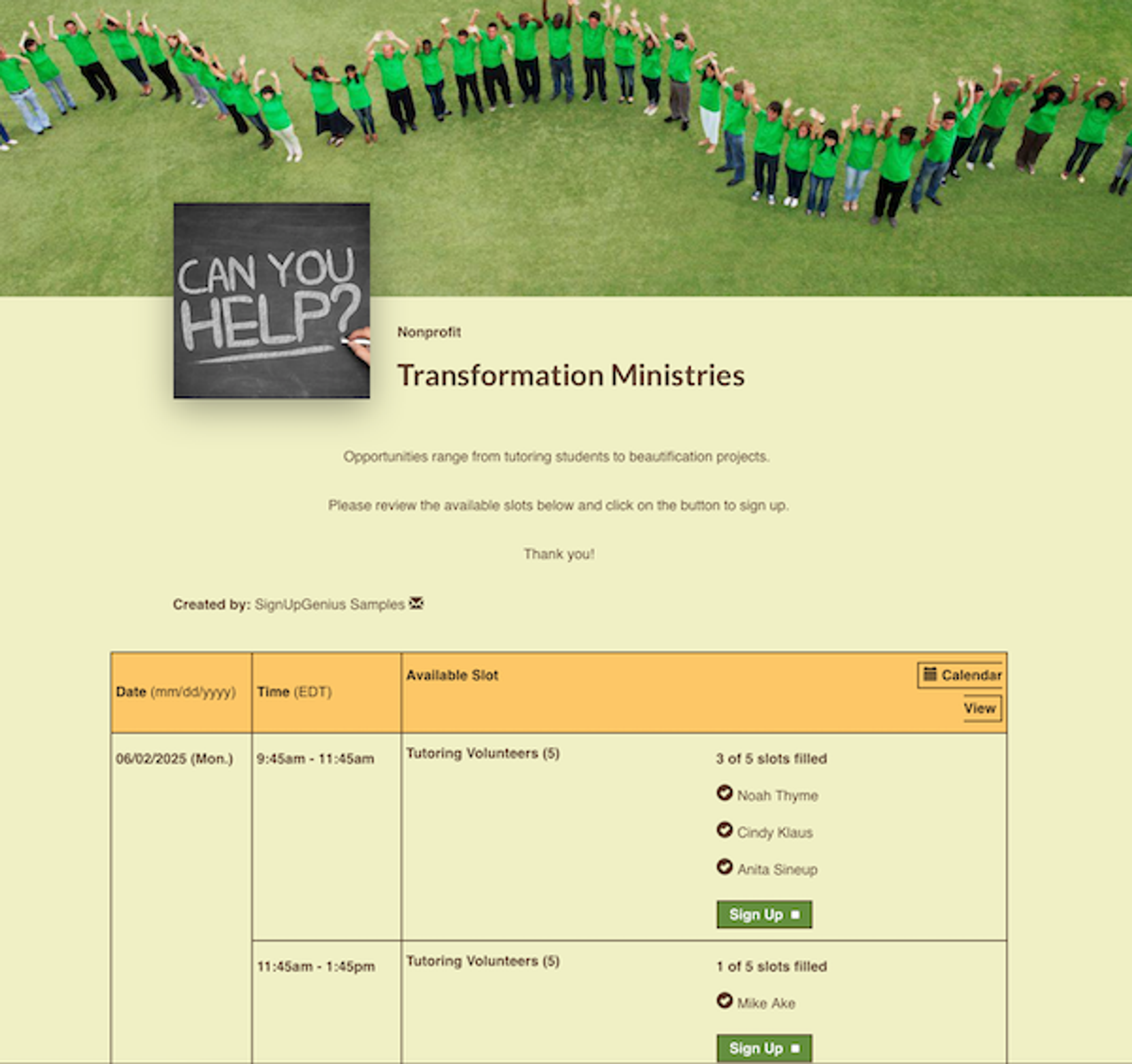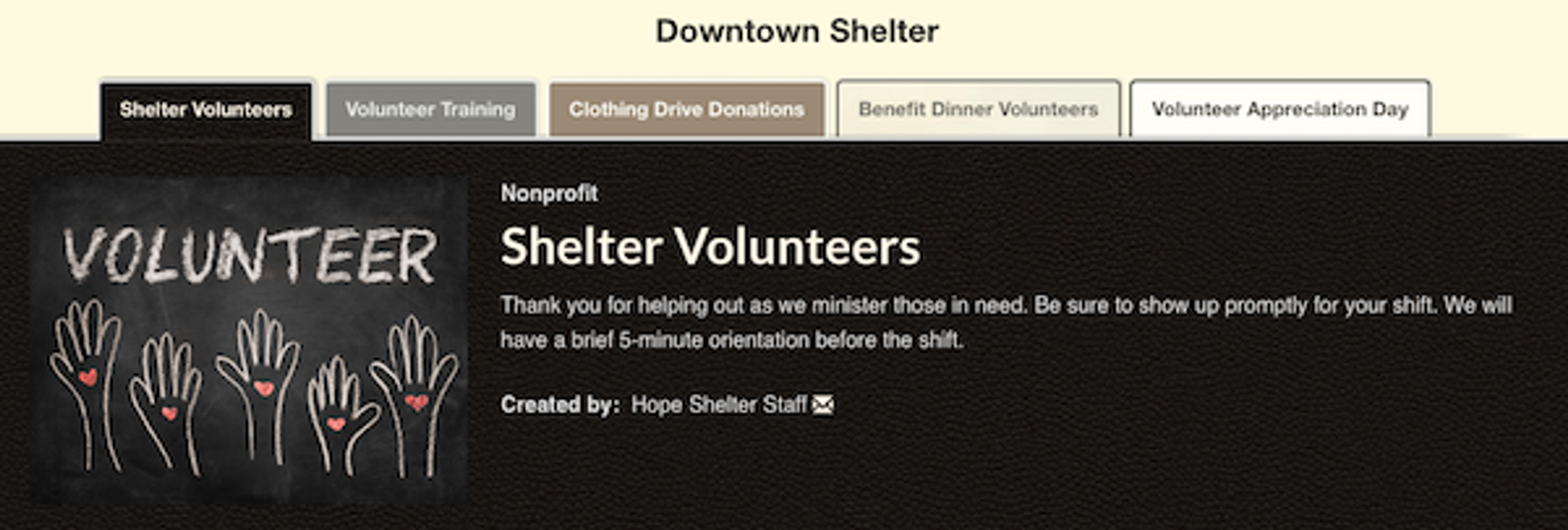 If you're realizing that your project will take place in shifts, recur on a regular basis or involve a variety of projects for multiple groups - it might be best to create multiple sign ups. We offer a number of options to display all your sign ups in one place. For example, our sign up Tabbing feature is great way to link multiple sign ups together to showcase multiple service opportunities. This makes it easy for your audience to locate a grouped collection of similar volunteer opportunities.