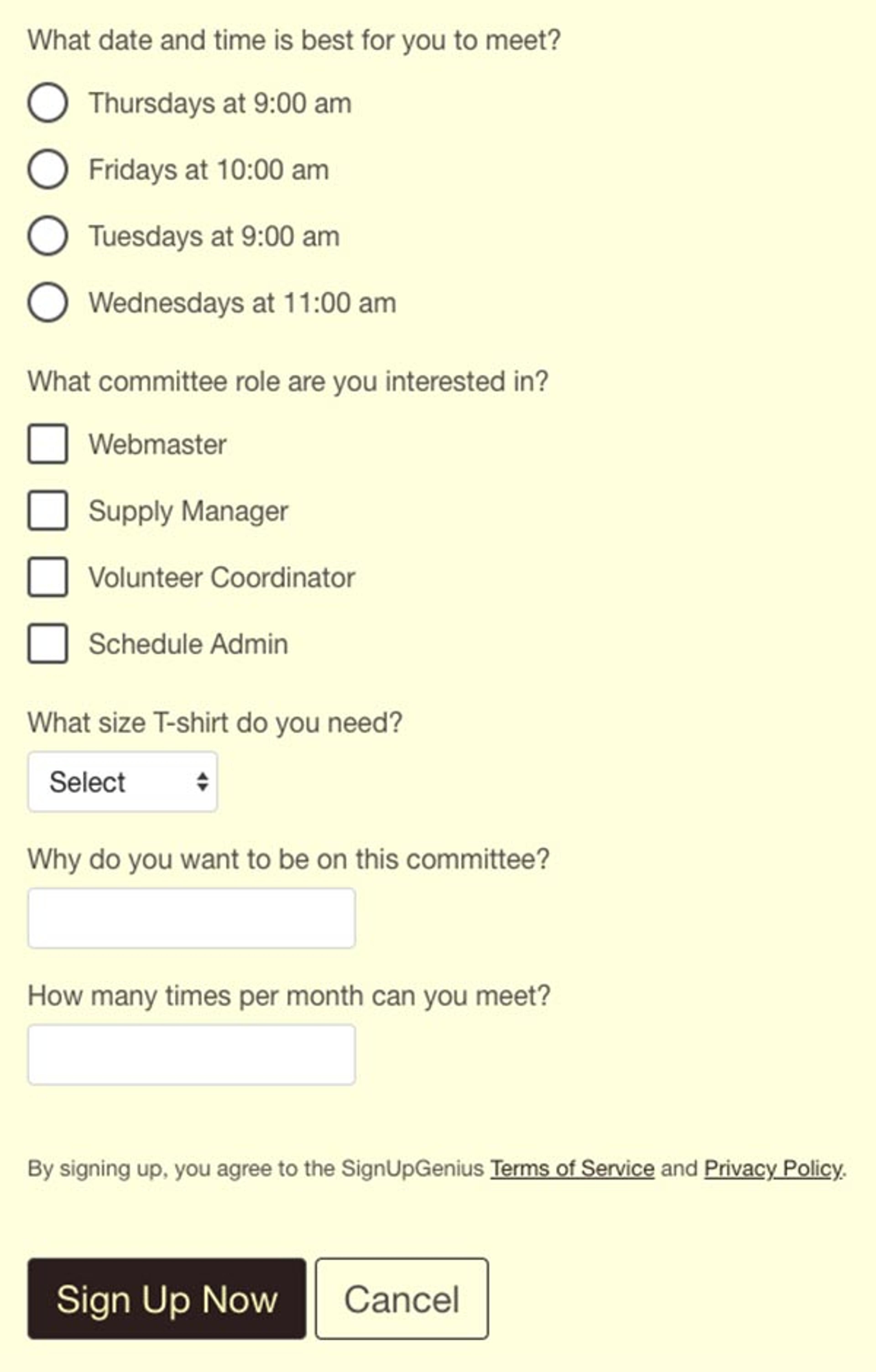 When people access your sign up, they'll see the survey questions once they sign up for a certain slot and submit it. For example, if you are collecting sign ups and gauging interest for specific committees, people will select the committee they want to sign up for. Then they'll see the survey questions they'll need to complete.