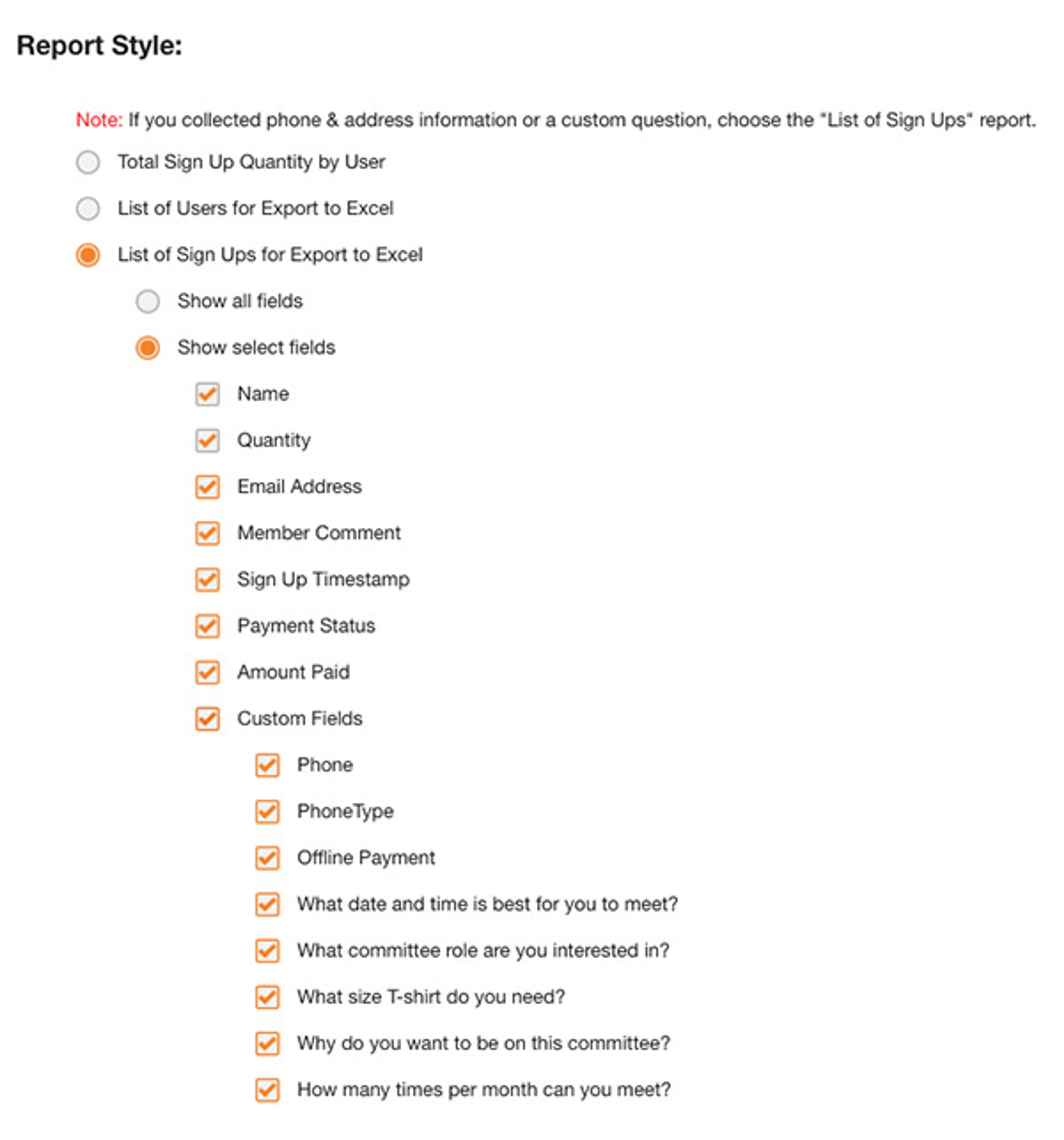 When selecting the Report Style, choose List of Sign Ups for Export to Excel. From there, either show all fields or only select fields. Your survey questions will appear under Custom Fields.
