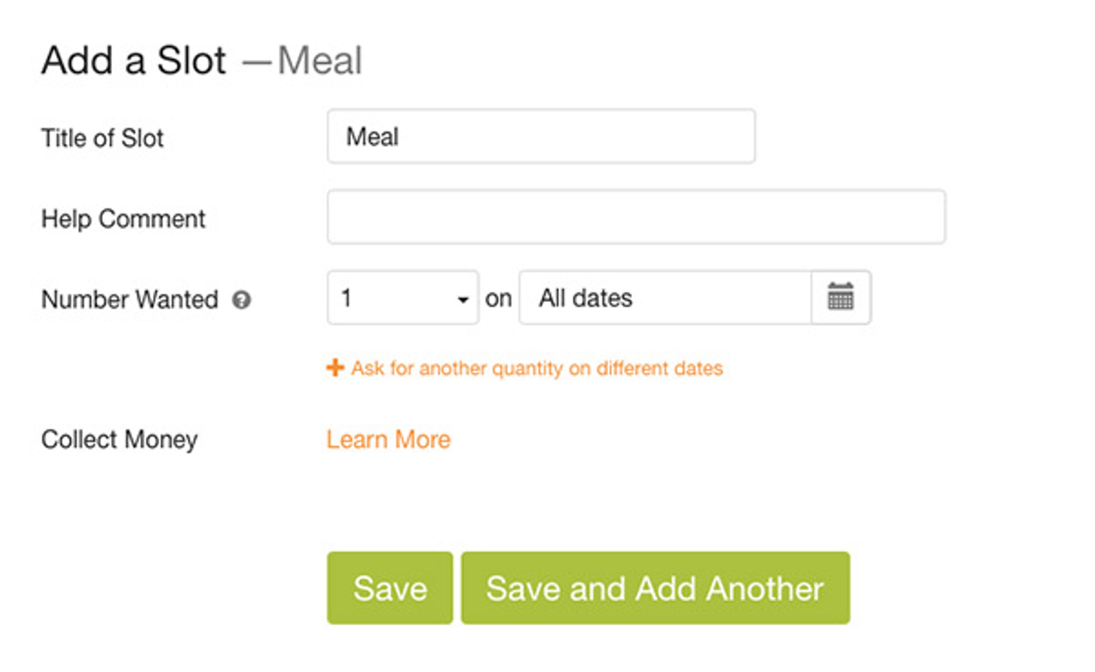 Choose the Number Wanted as the maximum number of people who can sign up for the slot. For meals it often makes the most sense to have one person per slot, so choose the number 1. Save or Save and Add Another if you'd like more options.