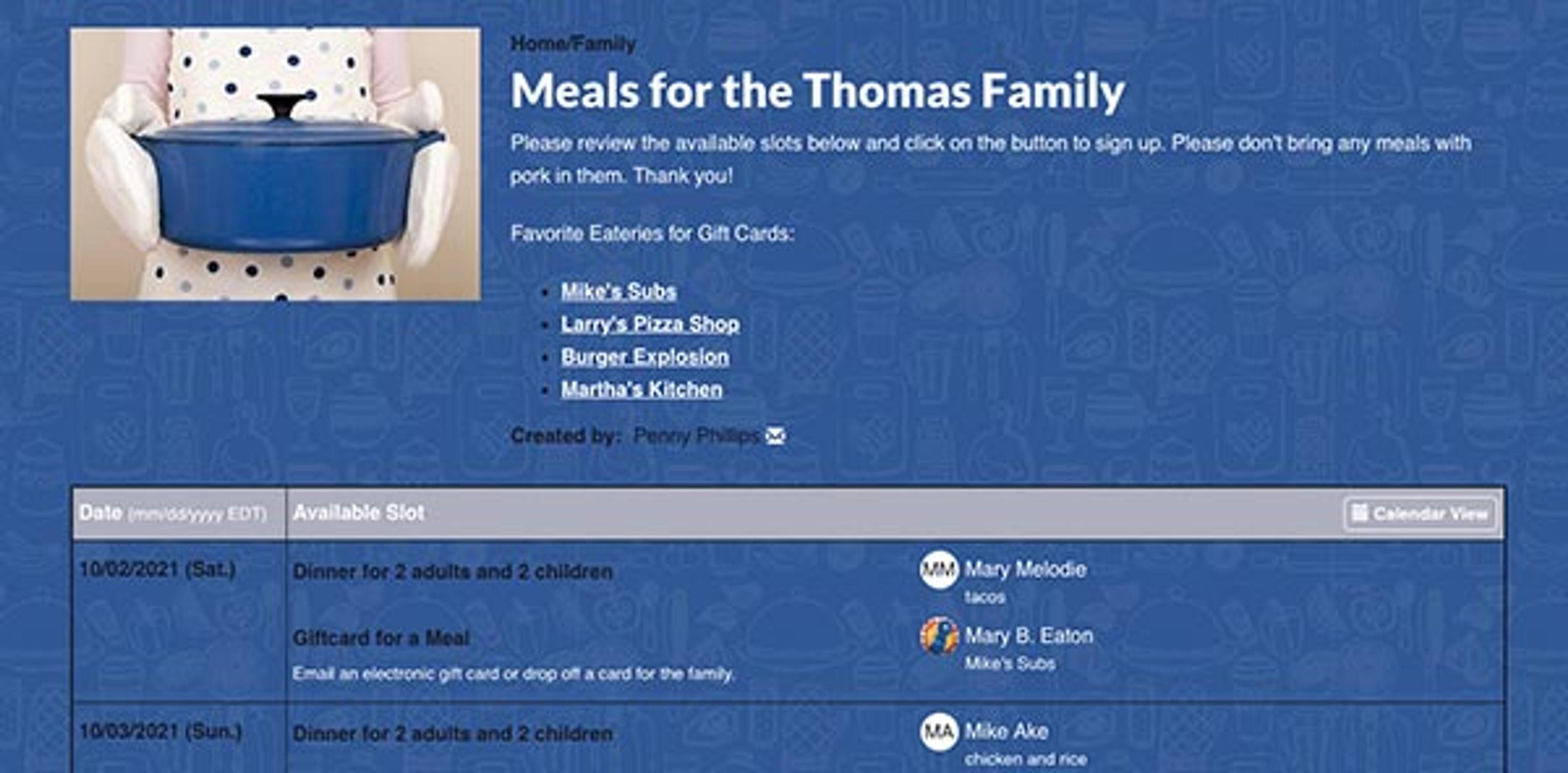 Providing meals for families in need is a practical way to celebrate life's milestones or show generosity. It is also an exceptional way to help a family or community member in need. Whether a baby is born, there is a loss in the family, or a neighbor has a debilitating illness, setting up a meal sign up can help when you want to offer practical help.
