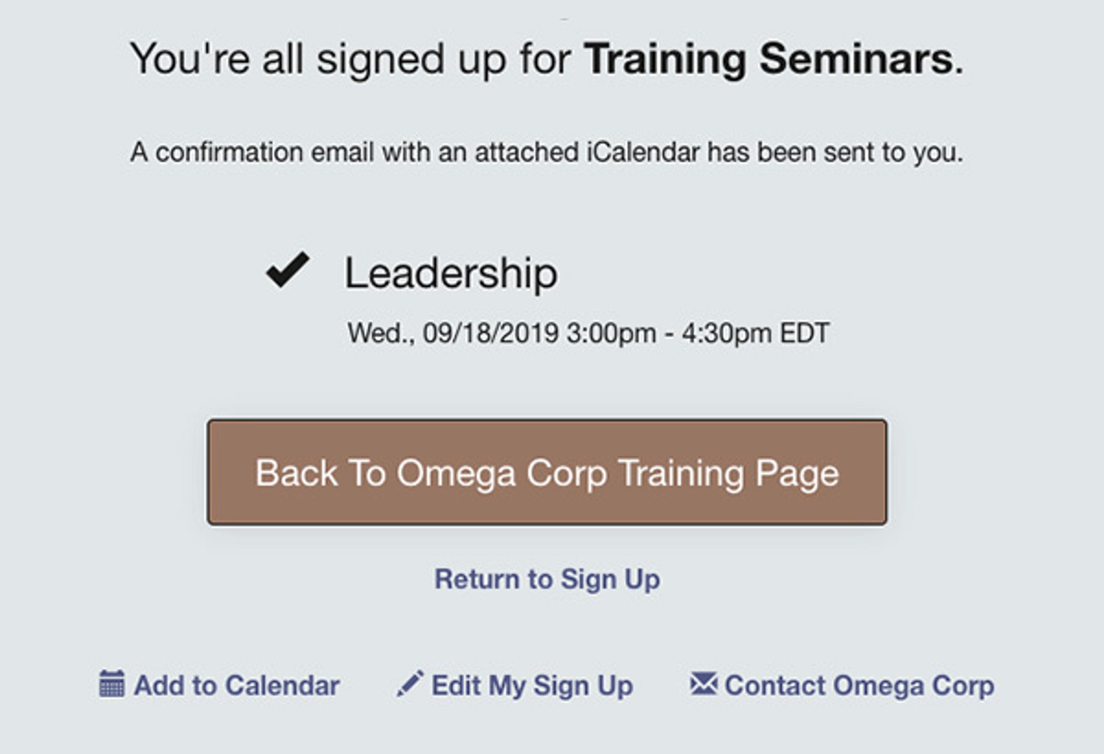 - Redirect trainees back to the company website after signing up. The Back to Website button is customizable and can direct participants to any web page you prefer. This creates a seamless sign up experience for participants.