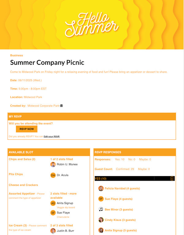 Sign ups also give managers the option to ask for assistance at upcoming company events. Add slots to request volunteers to help set up, bring food and drinks, or help clean up after all the fun is over!