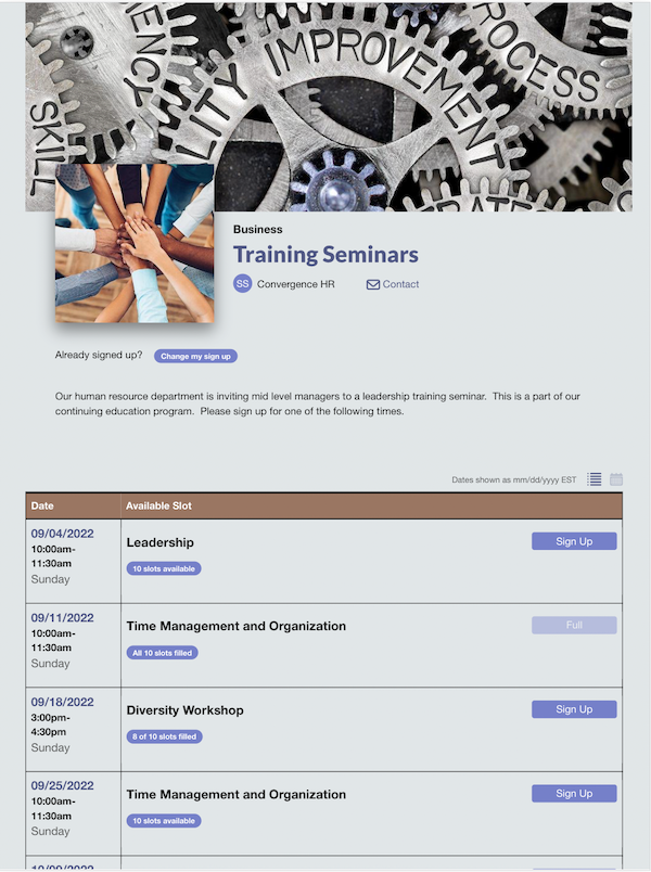Sign up software can play an integral role in organizing and scheduling training events for your team. You can use sign ups to offer registration for upcoming sessions, whether it’s for new hire onboarding or professional development for current employees.