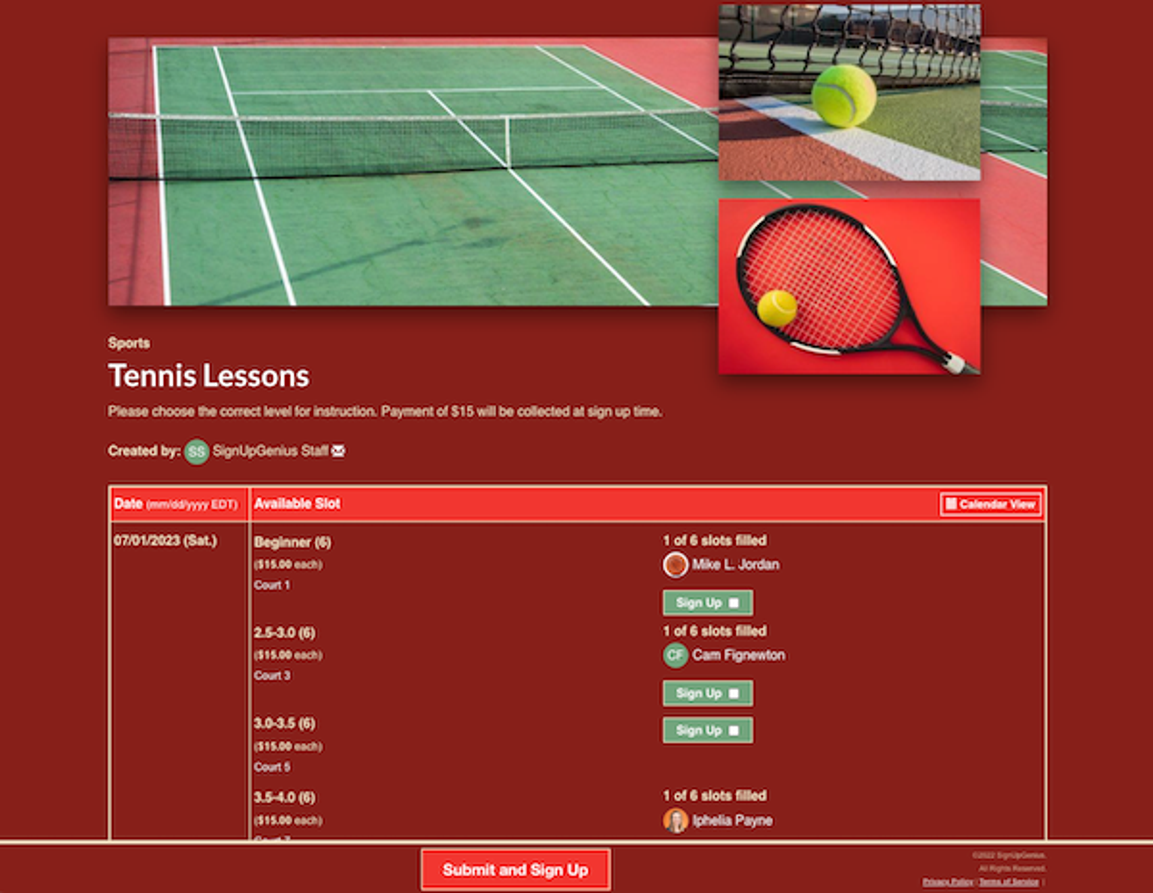 Whether you are planning a training workshop, a local festival or swim lessons - online sign ups are the perfect way to recruit or organize volunteers and attendees. Online sign ups make it simple for vendors, volunteers or attendees to register. Additionally, instructors can build out registration forms with our custom questions to collect attendee information.