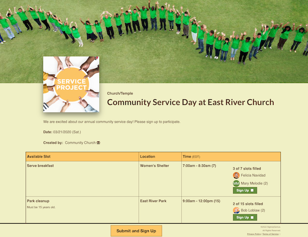 An online sign up makes it easy to organize your volunteers and recruit additional help to join your project. You can communicate the project time, location and special instructions right on the sign up.