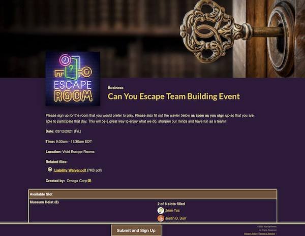Any team building event will require some organization. If you have a larger team, you will probably need to break people into manageable groups. For example, if you are coordinating scavenger hunts or escape rooms, you'll want to organize groups of about 6-8 people. With an online sign up, you can create slots and assign employees to teams or allow them to choose the team or type of escape room they'd prefer to participate in.