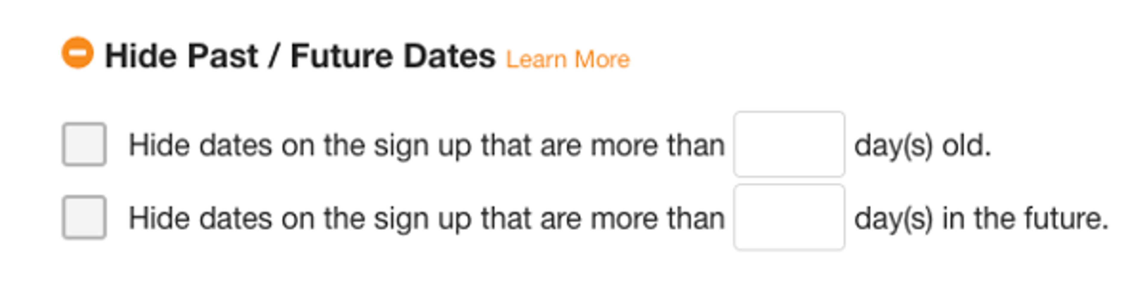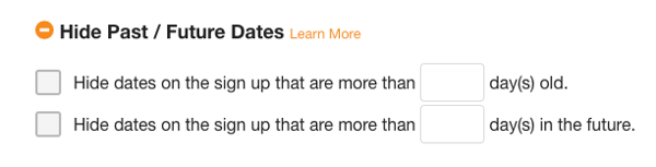 If you are booking appointments over an extended period time, you can select the option to hide past dates and to display dates a number of days into the future. As time passes, the sign up will automatically hide the dates that fall into the past and display new dates up to the number of days in the future that you have specified. This is a great way to prevent endless scrolling through slots to find current dates.