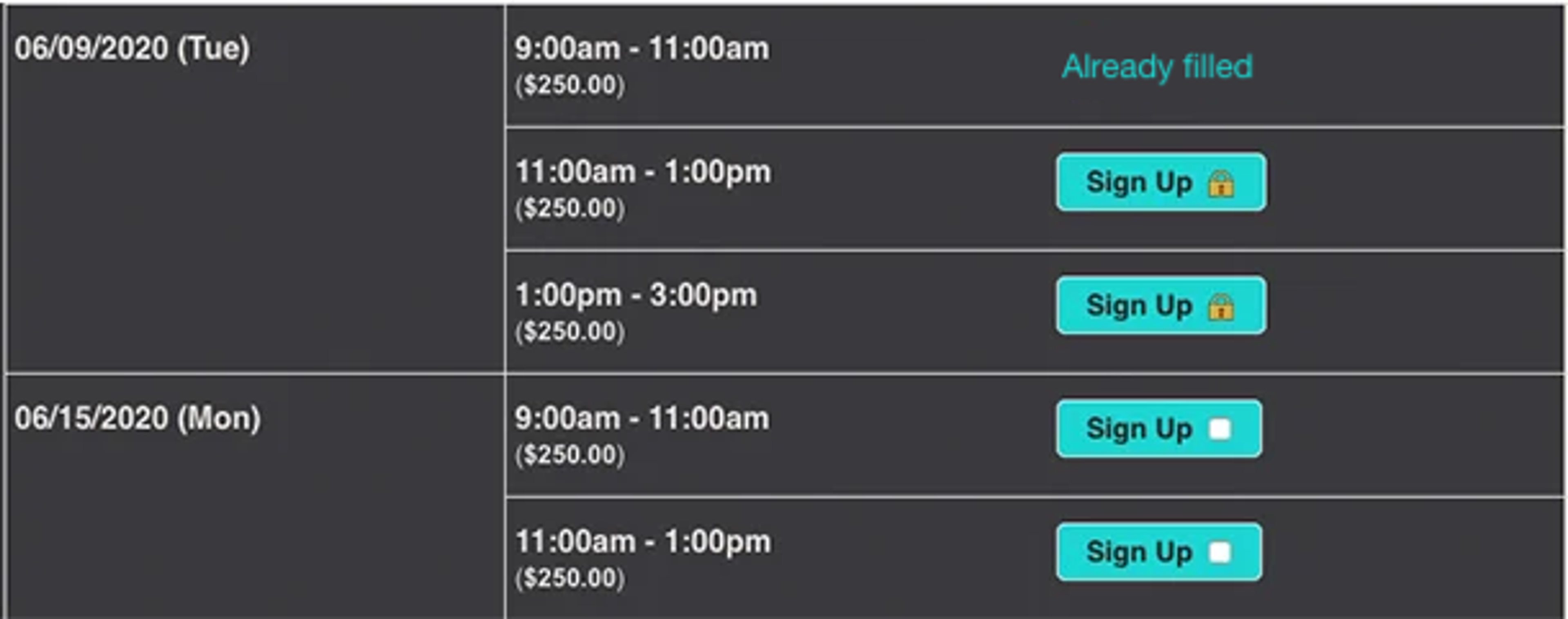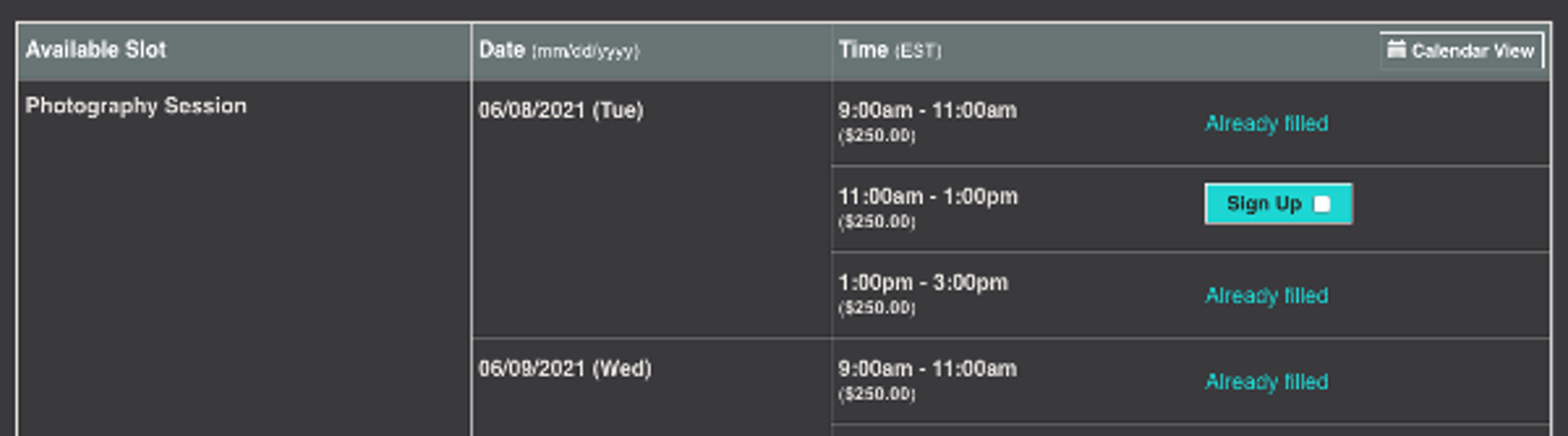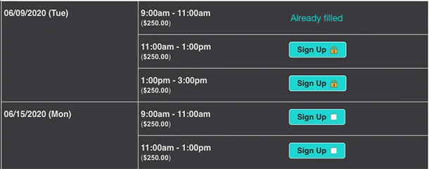 Once you have theme designs set up, your first sign up forms can serve as templates for any future booking registrations. Set up time slots, choose the option to collect money on those slots, and publish.
