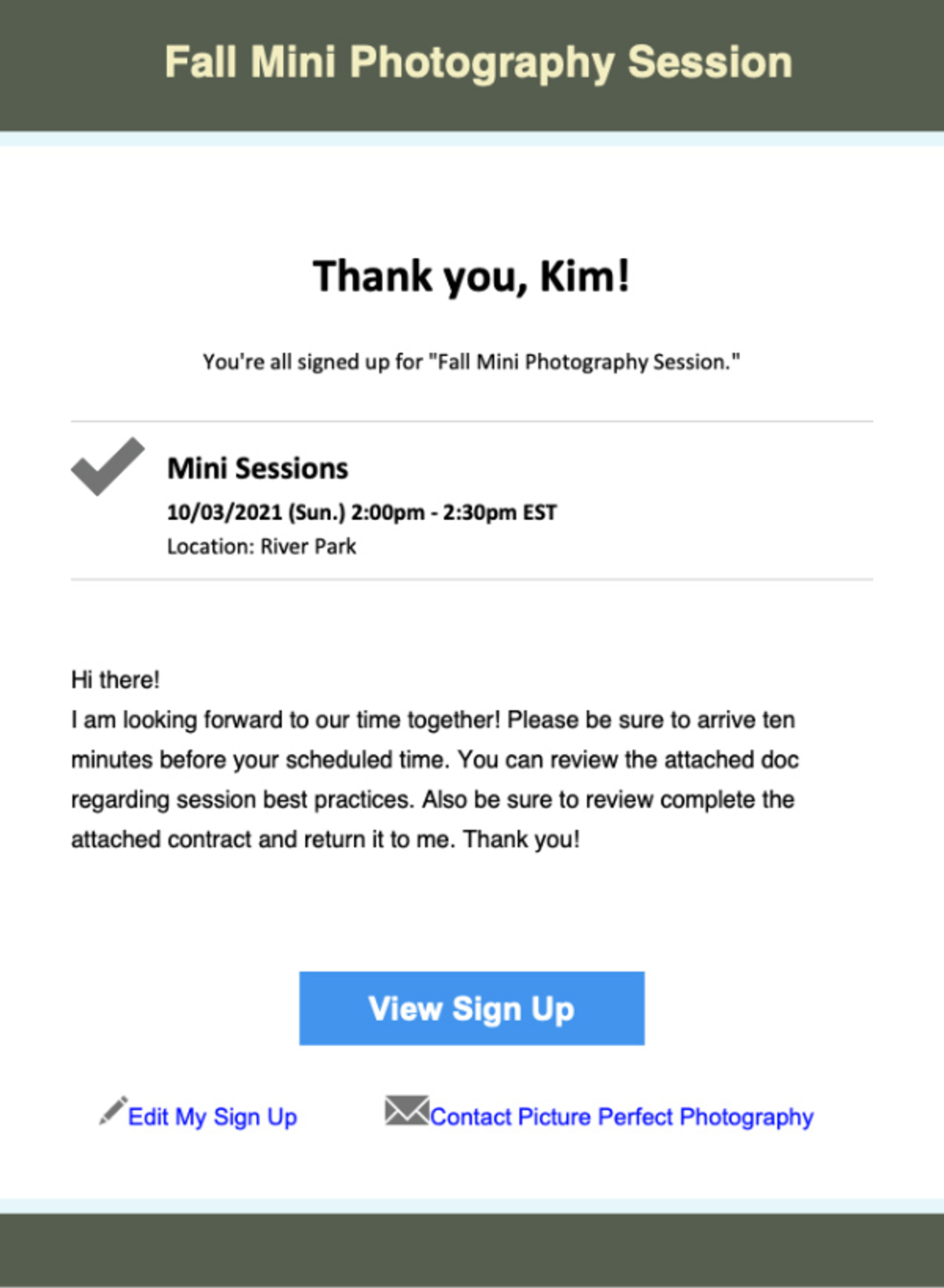 When a customer receives a confirmation email, it will include an attached iCal link that they can open to add the mini session appointment to their personal digital calendar. This link also appears on the Thank You page directly after they sign up.
