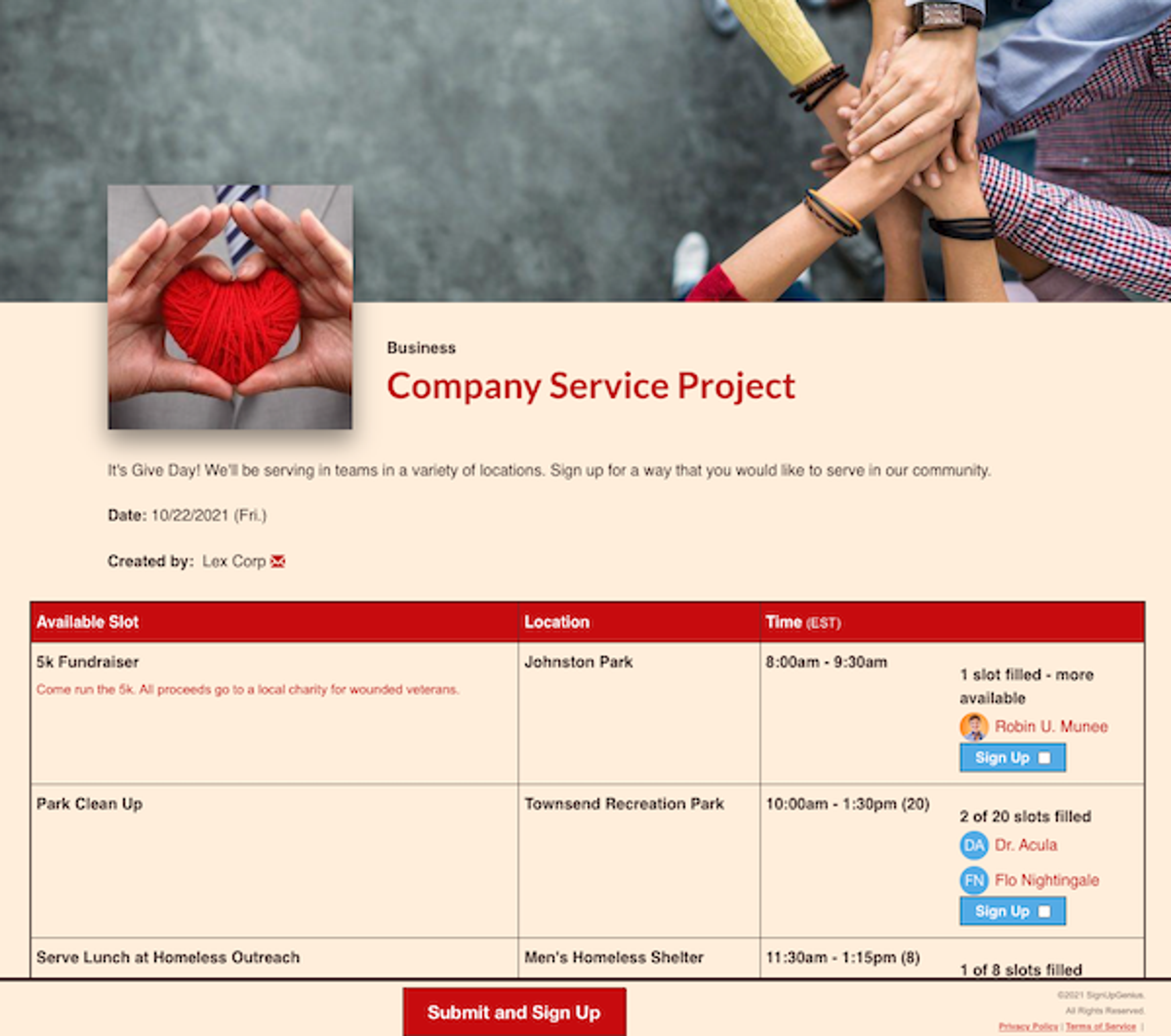 Coordinate your volunteers with an online sign up and include information like where to meet and what to wear. You can also include a custom question to find out information like t-shirt size or fun facts to spark conversation, like their favorite holiday movie. Plan to meet for lunch or dessert after you volunteer to share your experiences and celebrate the season.