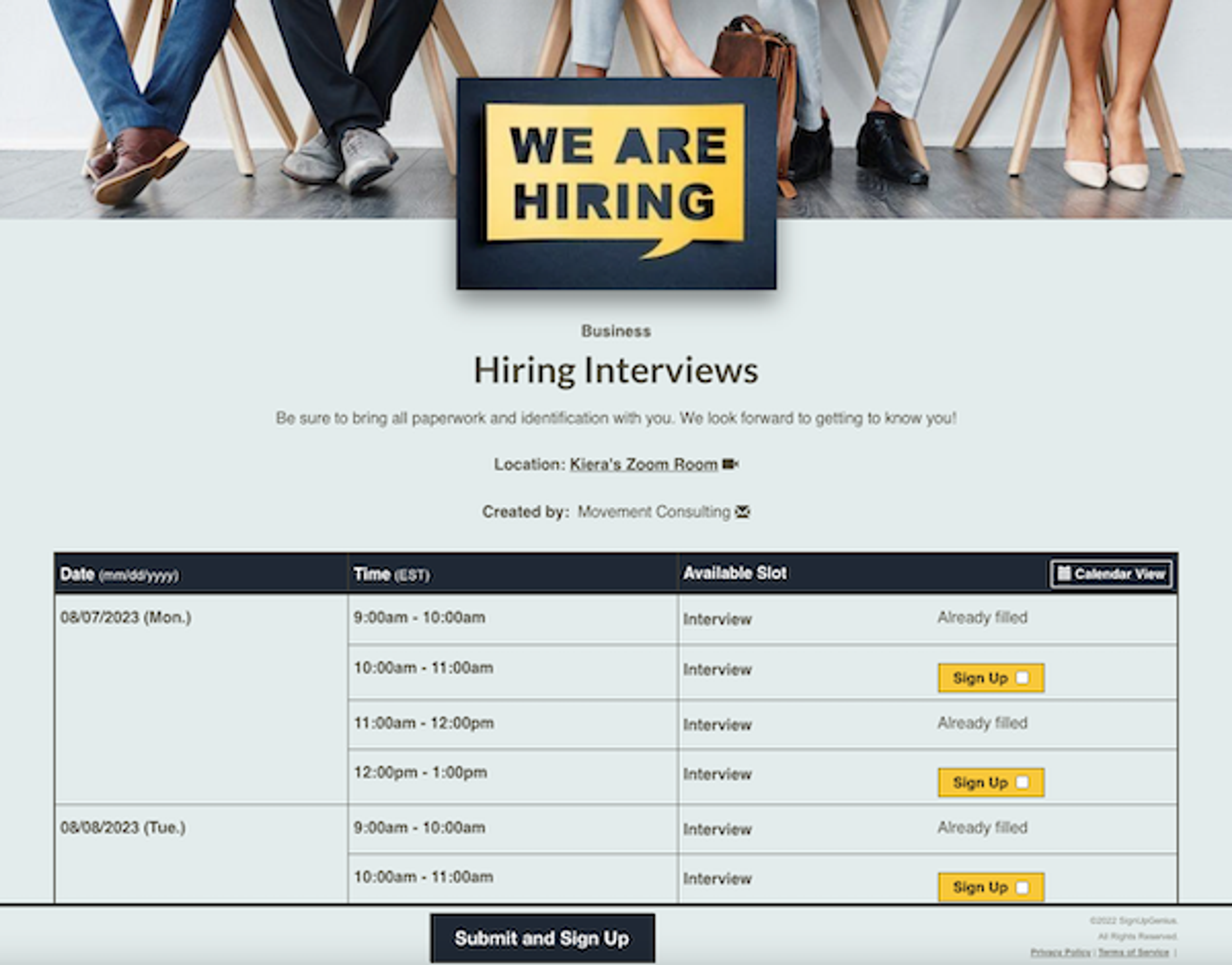 SignUpGenius has a variety of uses for businesses and entrepreneurs. Whether you are a consultant, personal trainer or photographer - online sign ups can help you organize meetings and appointments with ease. You can book in-person or virtual appointments, and with our Zoom integration, you can include your video conference link on the sign up. Our tool can scale with your organization and even provide custom features to fit your branding and enterprise related needs.