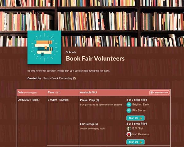You'll need to start planning early to ensure you have a strategy for successfully executing the event. Be sure to create a sign up with various roles and shifts for volunteers — including setup and takedown of the book fair. This way, you can staff volunteer help before, during and after the event.