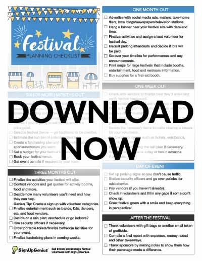- Decide Ticket Sales - Determine whether you're going to sell tickets and, if you are, set a price point. This is also the time you'll want to start researching potential ticket vendors if that's the route you want to go. Genius Tip: Sell festival tickets with an online sign up.