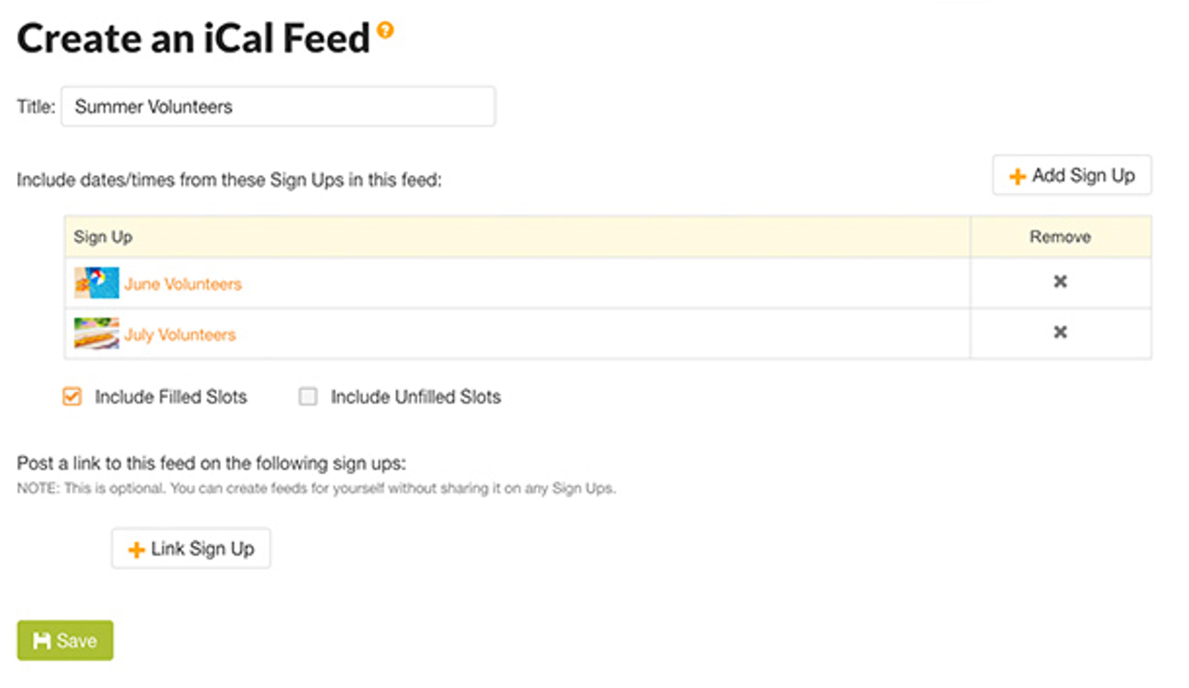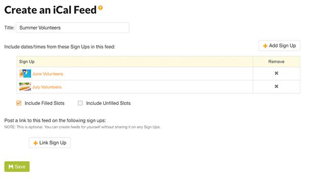 If you would like to make the calendar feed available for sign up participants, you can click Link Sign Up. Only choose this option if you want participants to be able to sync all items on the sign up(s) to their personal digital calendars.