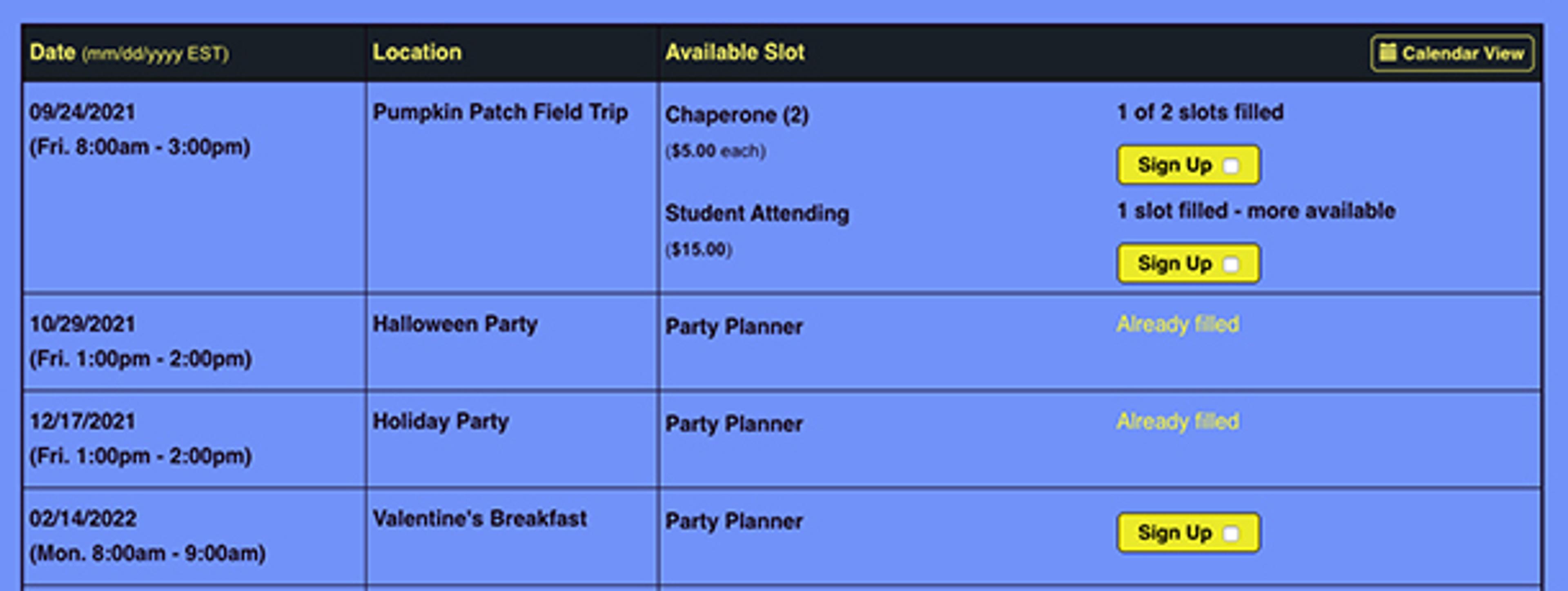 When participants view the sign up, they will see "Already Filled" if a slot is full, or they will see the number of filled slots of the total slots available.