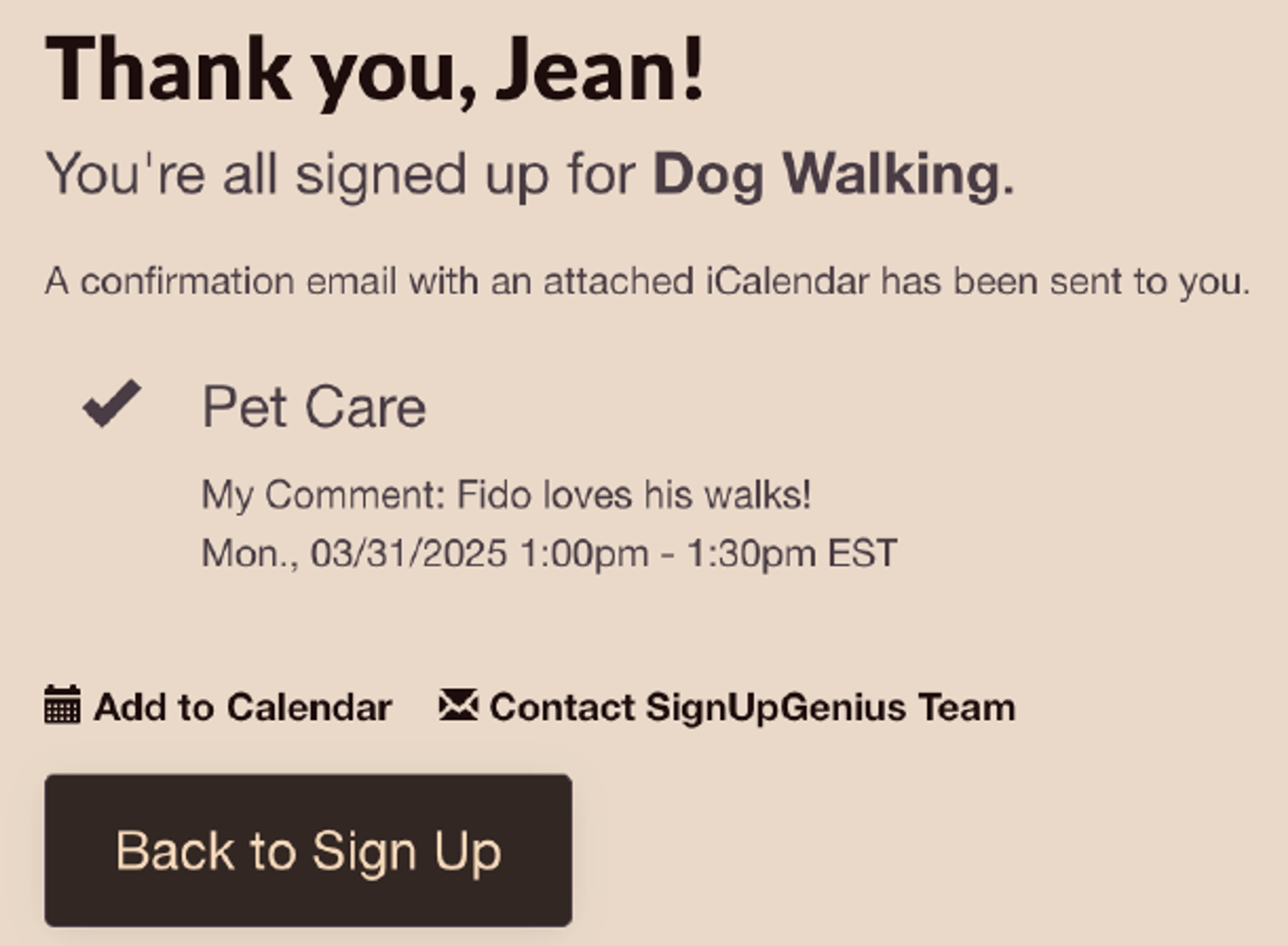 When you enter your email address, you will also receive an automatic confirmation email. If you have an account, you can log in to your account at anytime to view your active and past sign ups.